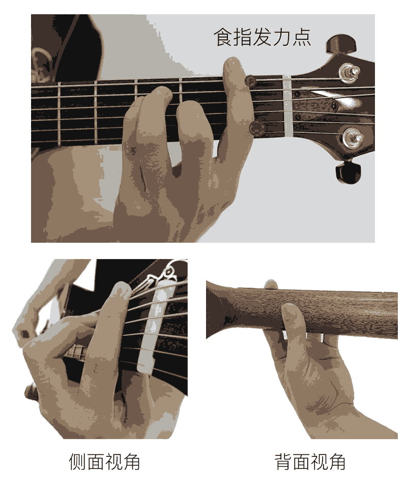 小窍门:可以集中力气在1、2、6弦三根弦,中间3、4、5弦可以虚按即可,因为其他弦有其他手指按了。
