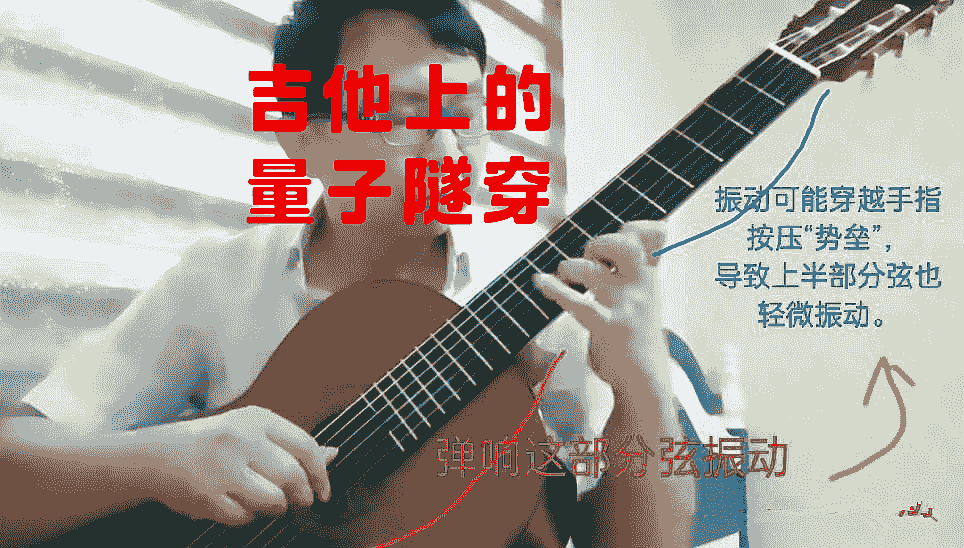 设想吉他上左手按弦,右手弹弦,此弦下半部分振动,可能传导致上半部分也有轻微振动。即使手指按弦能量大于弦振动能量。这可以类比量子隧穿效应。