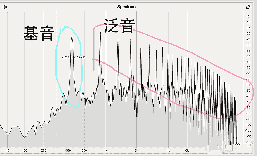 单独弹响一根琴弦,所产生声音并不是纯音,而是基音和泛音(谐波)叠加在一起,几种不同频率的波混合而成的声音。