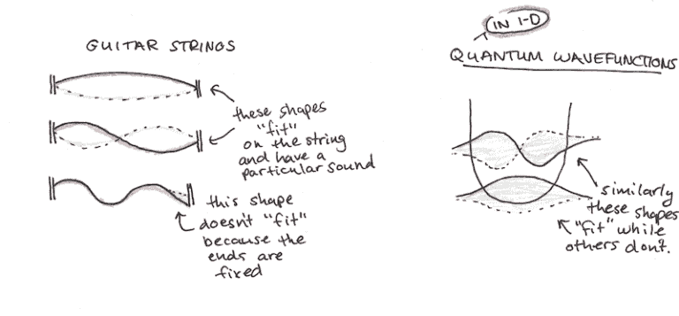 在量子力学中,一个量子系统如电子,其状态由波函数描述,也包含了系统所有可能状态的叠加,就跟吉他弦上的泛音一样。